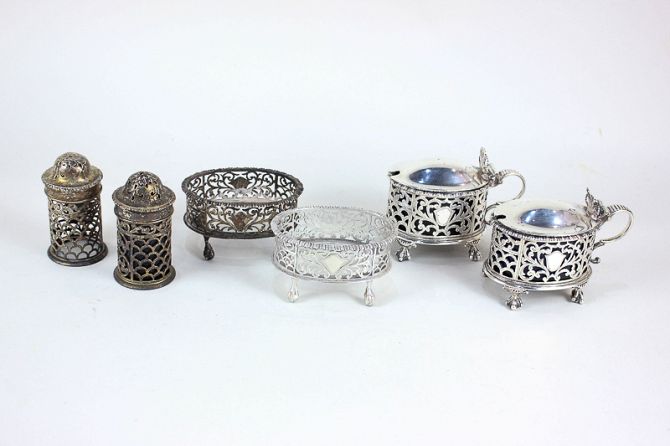 A George V silver six piece cruet set, oval form with pierced decoration, on claw and ball feet (two complete blue glass liners only), maker Robert Frederick Fix, London 1919, 15oz
