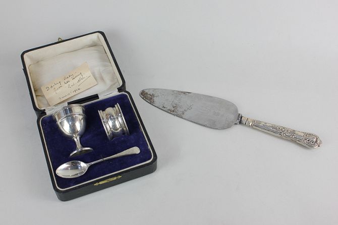 A George V silver christening set of egg cup, napkin ring and spoon, in case, maker S Blanckensee & Son Ltd, Birmingham 1923, together with a silver handled cake slice