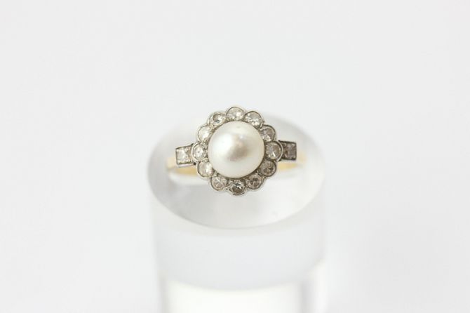 A pearl and diamond cluster ring, the pearl within a border of twelve eight cut diamonds and a smaller stone to each shoulder (the pearl untested)