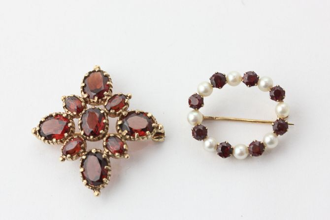 A garnet nine stone brooch/pendant in 9ct gold, and a garnet and pearl brooch