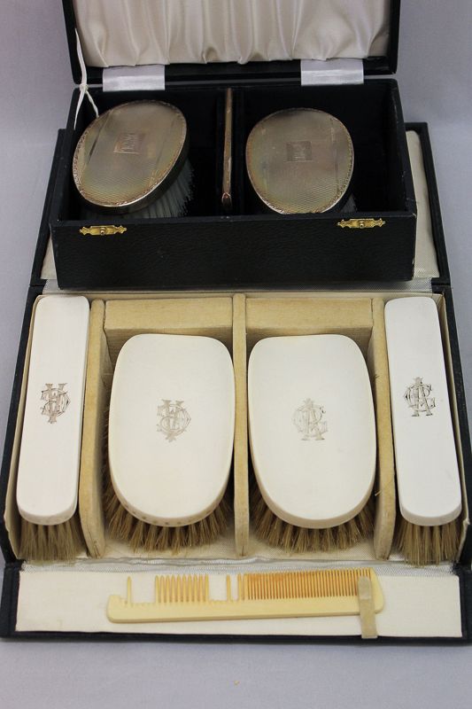 A set of four ivory handled brushes (two hair and two clothes) in case; together with two sterling silver back hair brushes in case, initialled BEA