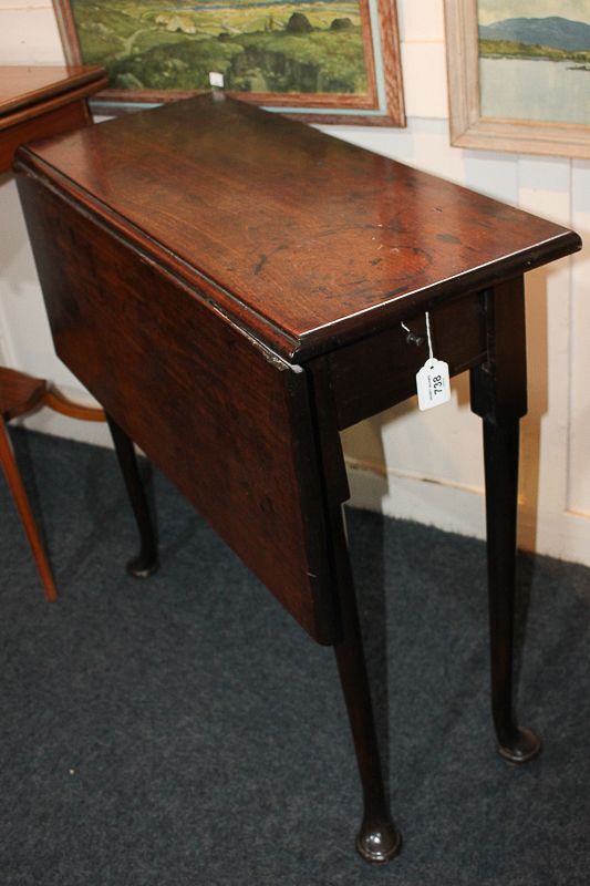 A George III mahogany rectangular side table with single drop leaf and end drawer, on fold-out front leg and three further legs on pad feet, 76cm