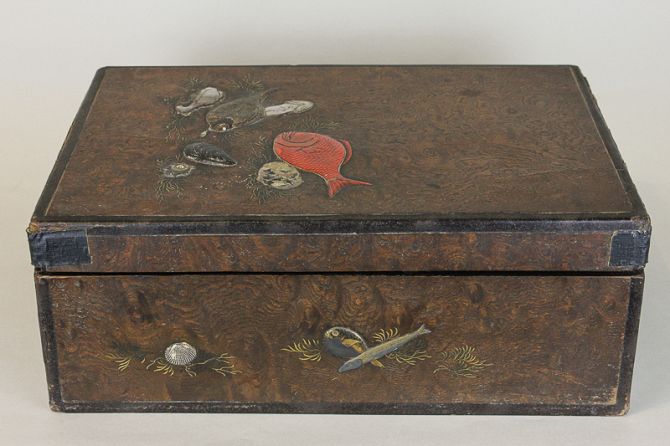 A 19th century Japanese wooden box with lacquered and mother of pearl decoration of fish and gilt 'seaweed' with lift off top and 'gold' speckled interior tray, 44cm by 32cm