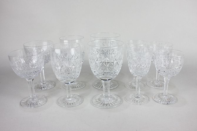 A part set of ten Thomas Webb cut glass wine, champagne and liquor glasses, four Rogaska water goblets with two matching wine glasses, two rummers and other cut glass