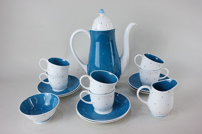 A mid 20th century Susie Cooper porcelain coffee set for six in blue and white spot design (one saucer a/f)