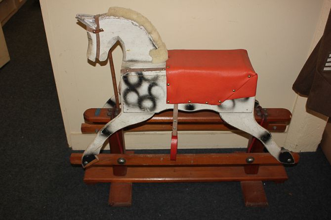 A 20th century wooden rocking horse on stand, with painted face and dapple grey markings, red leather saddle and studded reigns, 91cm