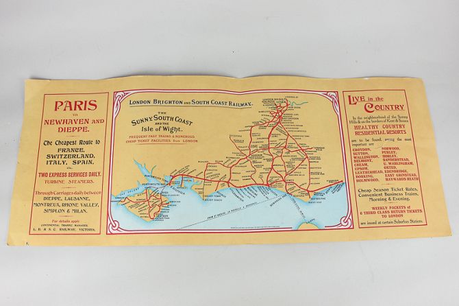 A London Brighton and South Coast Railway advertising poster, The Sunny South Coast and The Isle of Wight, unframed, 25cm by 62.5cm, (a/f)
