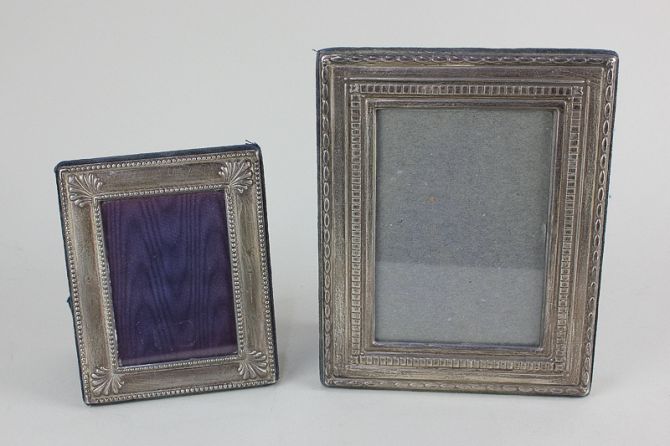A modern silver photograph frame, rectangular shape with decorative border, blue cloth backing and easel stand, 18cm high, and a similar smaller photograph frame, 13cm