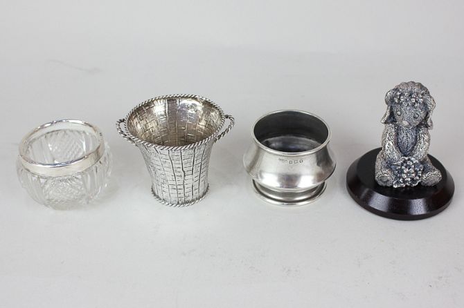 A George V silver basket, maker Charles Boyton & Son Ltd, London 1912 (a/f), a silver salt, a silver mounted cut glass salt, and a silver bridal teddy bear ornament