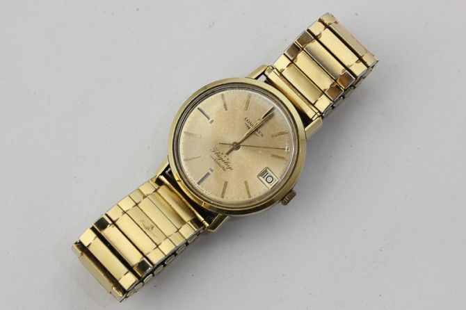 A gentleman's rolled gold Longines automatic watch on gilt expanding bracelet