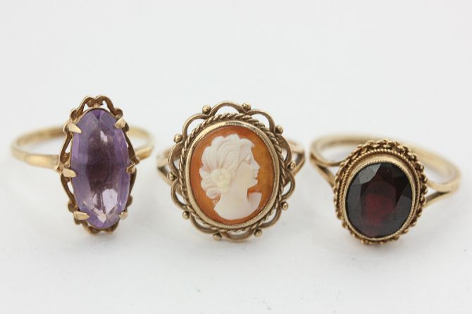 An amethyst ring, a garnet ring, a shell cameo ring, all in 9ct gold