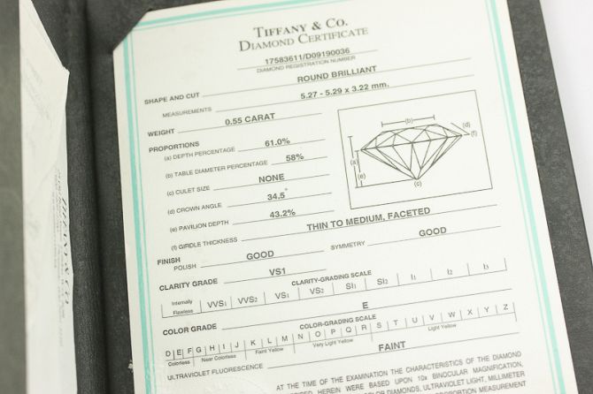Tiffany, a diamond single stone ring, the brilliant cut stone six claw set in platinum, with documents, case and certificate stating 55pts, E colour, VS1 clarity