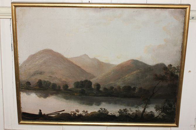 19th century school, view across a lake towards distant mountains, figure in a boat in the foreground, oil on canvas, unsigned, 42.5cm by 57cm