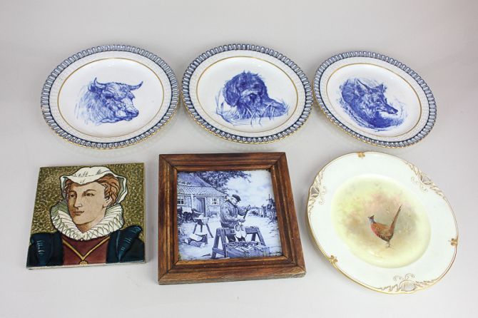 Three Mintons blue and white porcelain plates decorated with a bull, a fox and a dog, within a pierced border, 22.5cm, together with a Doulton plate decorated with a pheasant, 22.5cm, a Dutch tile, and another