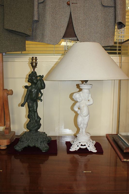 Two cherub and putti figure table lamps, the cherub in green, 46cm, and putti in white, 39cm, (a/f)