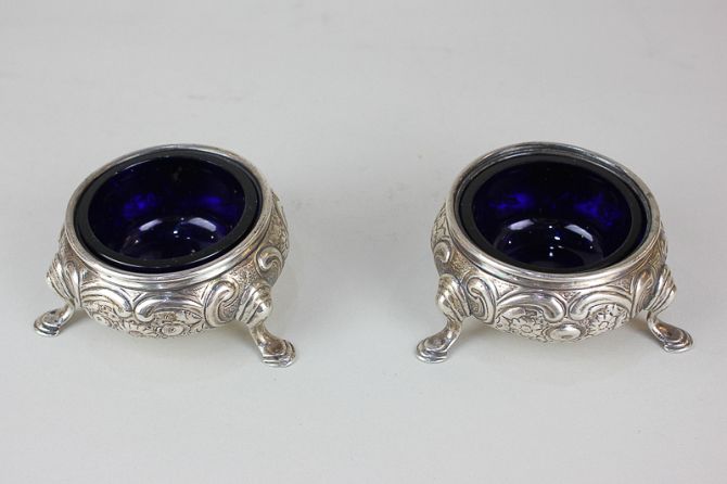 A pair of Victorian silver cauldron salts, maker William Moulson, London 1845, with embossed design and blue glass liners, 6.5oz