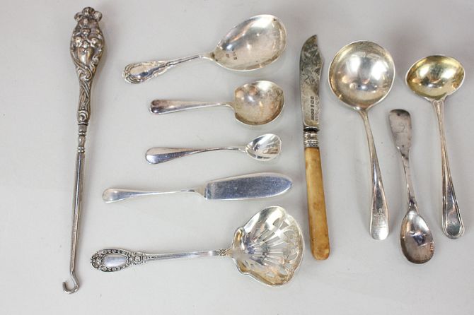 An Edward VII silver caddy spoon, sifter spoon, small ladle, various cruet spoons, and a button hook with embossed scroll handle marked Sterling