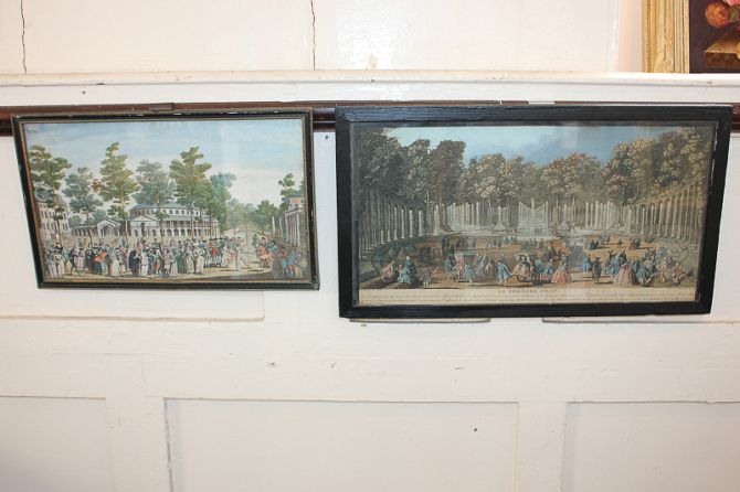 After Canaleti (Canaletto), a view of the rotunda, house and gardens at Ranelagh, 18th century coloured engraving, inscription verso, 23cm by 38cm, and another 18th century coloured engraving after J Rigaud, 'Le Theatre d'Eau', figures and a procession of carriages in a public garden, with title and inscription beneath, 25cm by 47cm