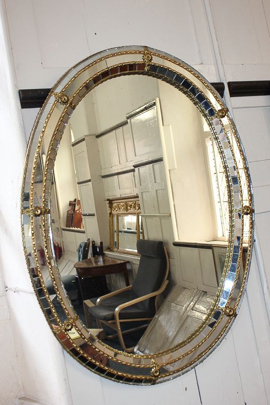 An oval gilt metal mounted wall mirror with frame inset with mirrored panels and gilt flowers, glass 67cm by 46cm