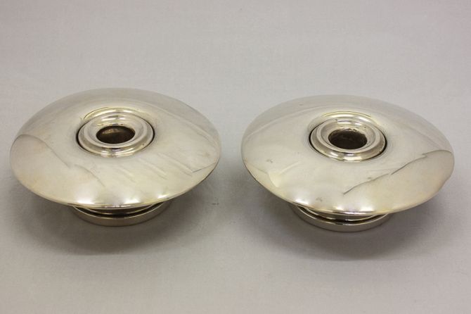 A pair of silver table candlesticks, maker Cohen and Charles, London 1966 with lift out candle holders and sloping circular wide rims on short bases, 10oz