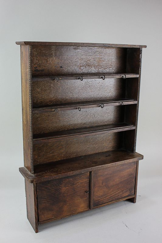 A miniature oak doll's dresser, the four shelves with hooks over two panel doors enclosing shelves, 52.5cm high