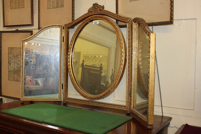 A giltwood framed three-panel dressing table mirror with floral surmount and central oval panel, 90cm, (a/f)
