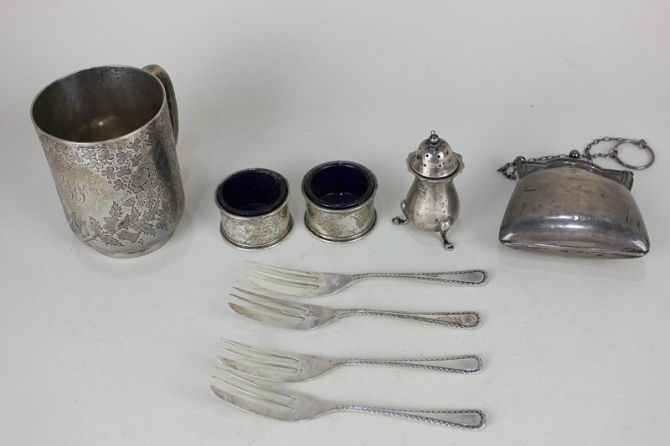 A George V silver mug with rose and thistle floral decoration, with engraved initials, maker Robert Ashworth, London 1911, 9cm, a silver purse, pair of circular salts, pepperette, and a set of four cake forks