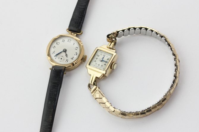 Two lady's 9ct gold wristwatches, one on a gilt metal bracelet