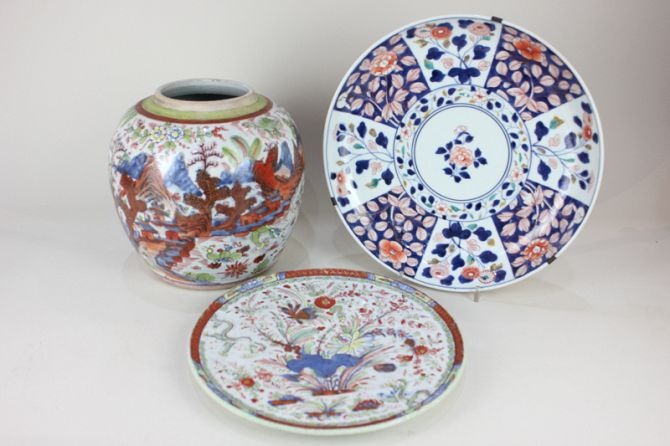 A Chinese Cantonese pottery ginger jar (missing cover), with brightly coloured design of dragons, fish, flowers and butterflies over Imari palette landscape, together with a similar dish and a Chinese porcelain charger with blue and orange floral design, 31.5cm diameter