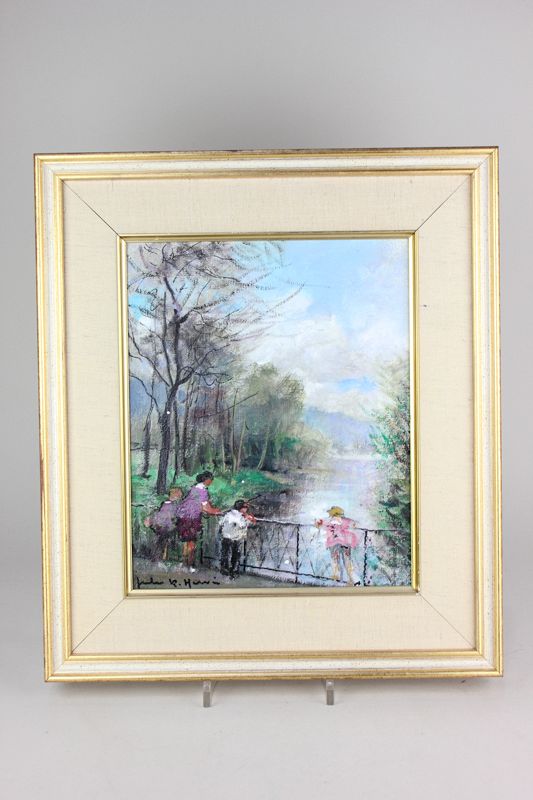 Jules R Herve (1887-1981), children on a bridge before a river, oil on canvas, signed verso, 25.5cm by 20.5cm
