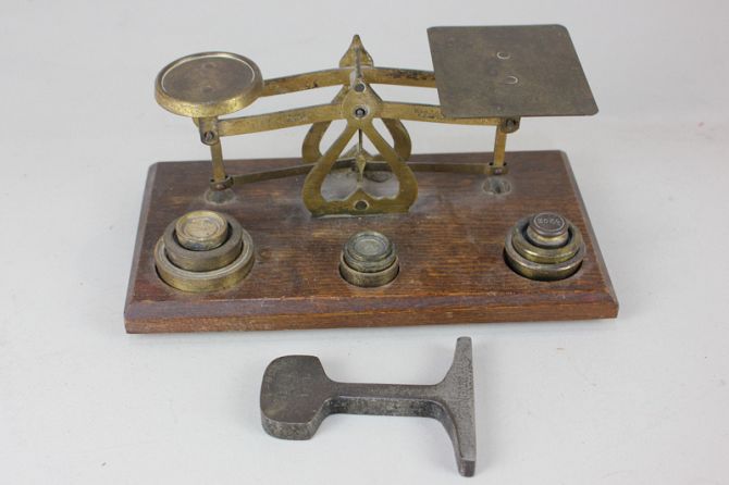 A set of Victorian brass postal scales with assorted weights, 20cm