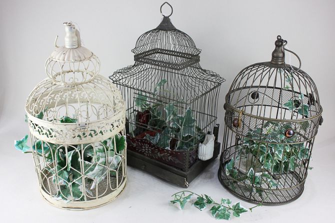 Three various metal and wire bird cages to include a pagoda shaped cage with glass panels, 52cm, (a/f)