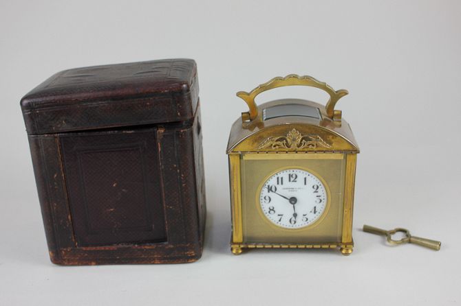 A gilt brass and bevelled glass cased domed carriage clock, the circular dial with gilt surround marked Collingwood & Son Ltd, Paris, the movement stamped Made in France, with key and leather carry case, 12.5cm high