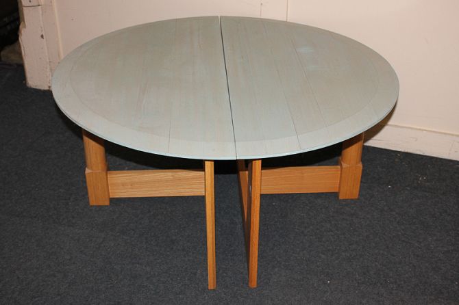 A pair of bespoke Edward Hopkins English ash D-shaped occasional tables, with pale blue-green painted tops, 97cm, with paperwork