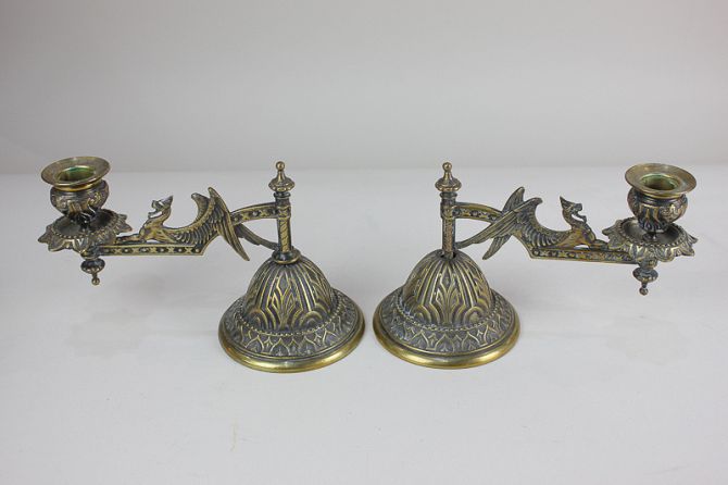 A pair of Victorian brass candlesticks with griffin supports , 12.5cm high