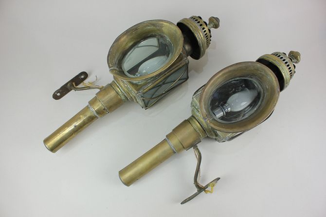 A pair of 19th century brass coaching lamps, each with oval glass front panel, 47cm long