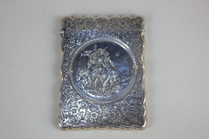 An Edward VII silver card case embossed with a scene of two lovers kissing on horseback, maker William M Hayes, Birmingham 1905, 2.5oz