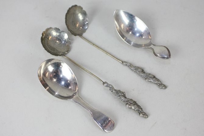 A George IV silver fiddle pattern caddy spoon with engraved initials, London 1826, a French silver caddy spoon with oval shaped bowl, and a pair of Indian small serving spoons