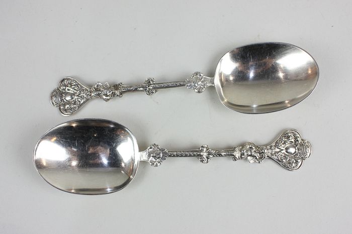A pair of Victorian silver serving spoons, maker Charles Stuart Harris, London 1891, with figural handles and crested finials, 3.5oz