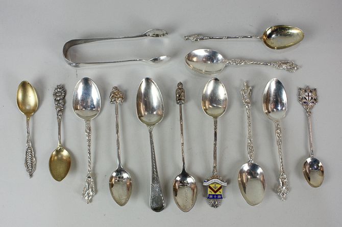 A collection of assorted silver tea and coffee spoons including a George III bright cut engraved teaspoon, apostle spoons and commemorative spoons, and a pair of Edward VII silver sugar tongs, 5.5oz