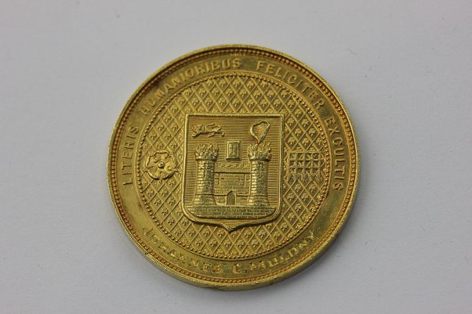 A Trinity College Dublin gold medal die-struck with the bust of Elizabeth I and 'Literis Humanioribus Feliciter Excultis', 32g - 39mm, one of four gold medals won by John Chartres Molony who studied Classics at Trinity College Dublin in the late 1890's and later held high office in India and wrote published works on South India and Ireland