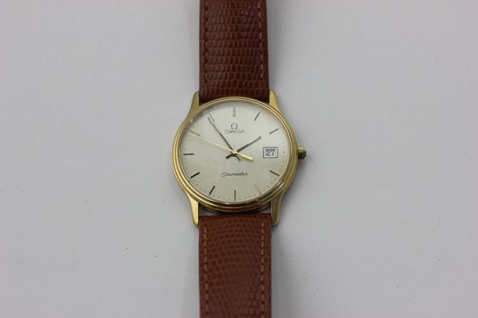 A gentleman's 9ct gold Omega wrist watch, Seamaster quartz with date