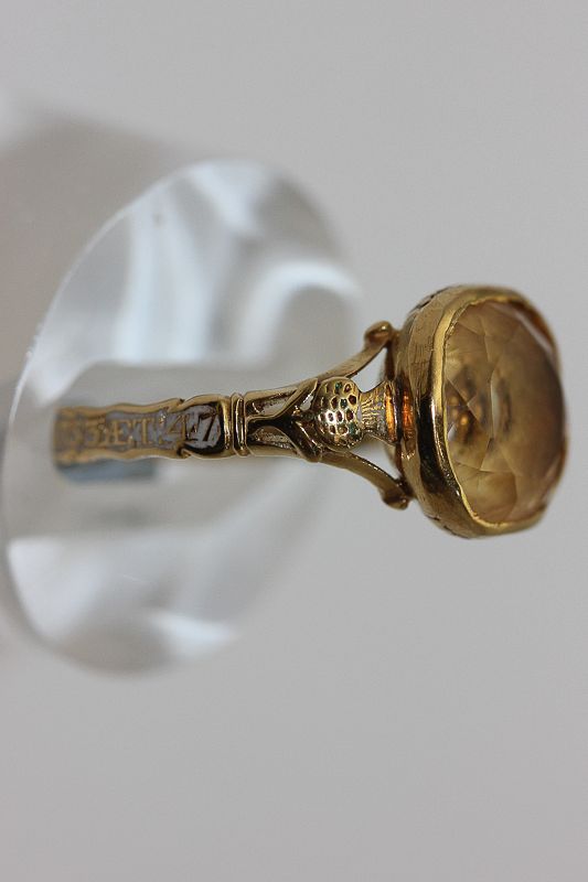 Of Jacobite interest, a gold, enamel and citrine mourning ring, the shank carved with "DR ARCHIBALD CAMERON. OB. 7. JUNE 1753. AET. 47" on a white enamel ground, the shoulders pierced with a thistle and a white enamel rose and rubover set at the centre with a cushion cut citrine. **Archibald Cameron was the last Jacobite to be hanged at Tyburn for his participation in the 1745 Jacobite uprising**