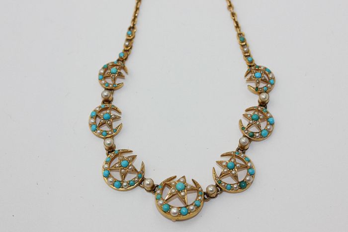 An Edwardian turquoise bead and split pearl necklace with crescent and star links 16.2g gross