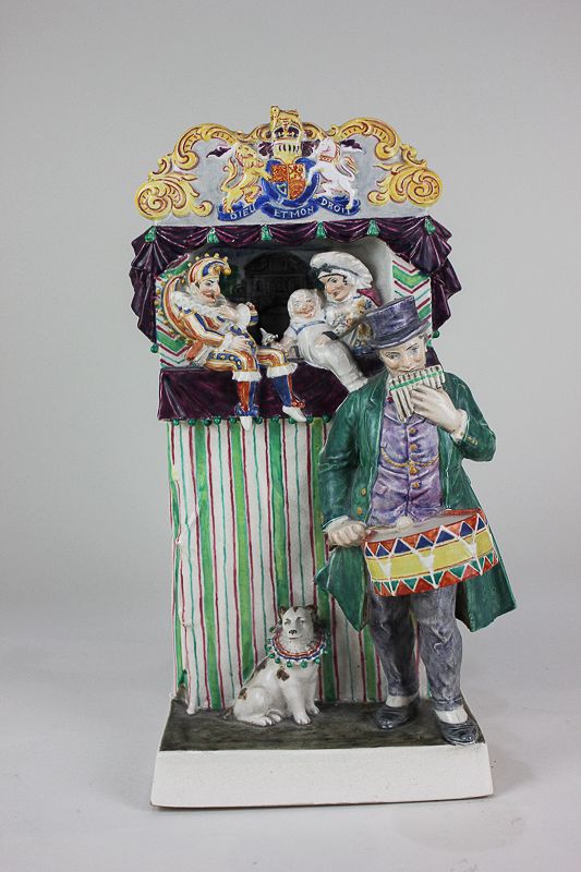 A Charles Vyse 'Punch & Judy' pottery figural group modelled as a street musician with his dog in front of the traditional puppet theatre booth, incised 'Charles Vyse Chelsea', 32cm