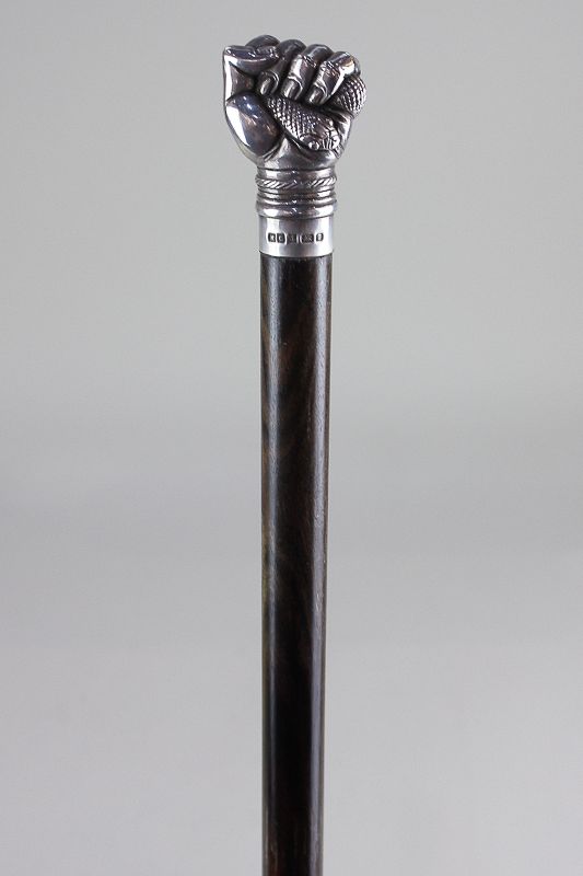An Elizabeth II silver mounted figured ebony walking stick modelled as a fist holding a snake, maker KC, Birmingham 1993, 98cm