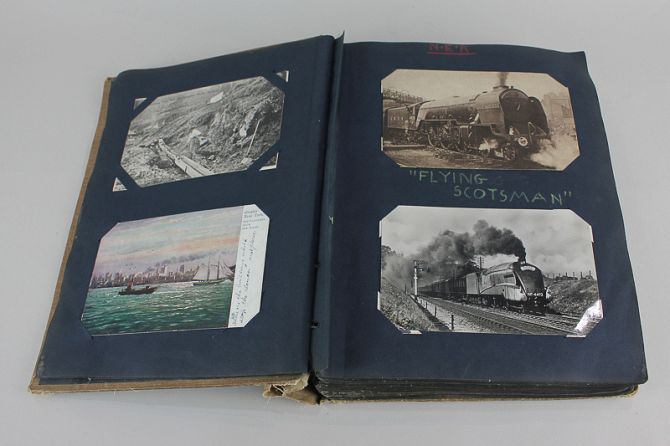 An early 20th century postcard album containing black and white and colour photographic postcards, including trains such as Flying Scotsman, ships such as Empress of India, views of Canada, Rotary Photographic Alphabet of Young Women, and others