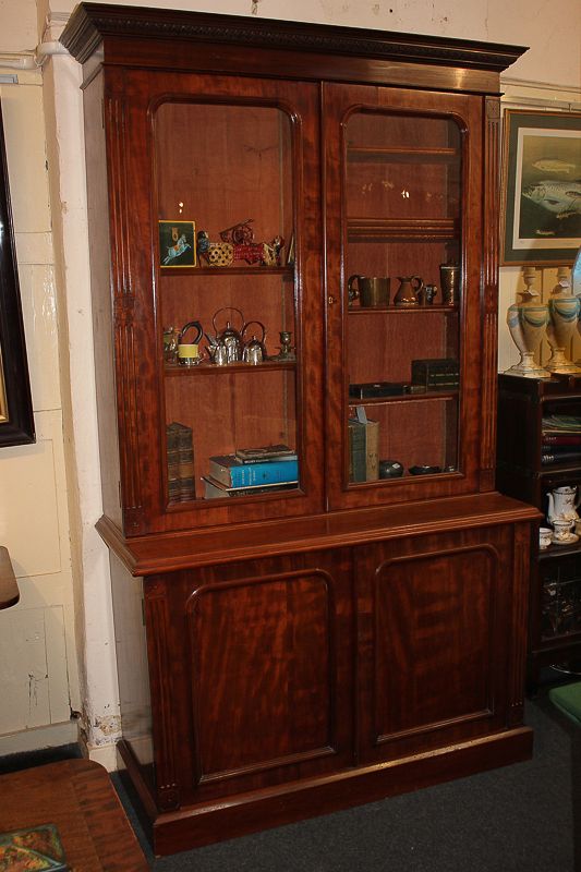 A Victorian mahogany bookcase, the cornice with decorative carved frieze above two glazed panel doors enclosing two sets of four shelves above a cupboard, on plinth base, 129cm