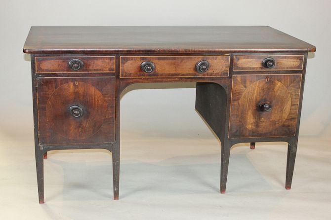 A George III mahogany sideboard with banded top and three drawers above arch and cupboard and cellarette drawer on square tapered legs, 148cm