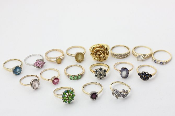 Four various 14ct gold and gem set rings, and thirteen various gem set 9ct rings
